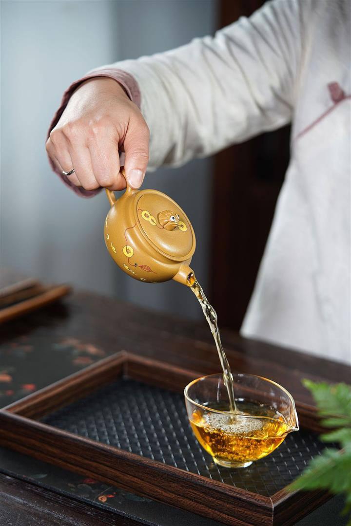 【泥料特點】砂土氣重,似淳實農民,日久使用,漸露鋒芒,養成變化,溫潤莊重。紫砂是壹種雙重氣孔結構的多孔性材質,氣孔微細,密度高。用紫砂壺沏茶,不失原味,且香不渙散,得茶之真香真味。紫砂使用越久,壺身色澤越發光亮照人,氣韻溫雅。紫砂壺長久使用器身會因撫摸擦拭,變得越發溫潤光澤。